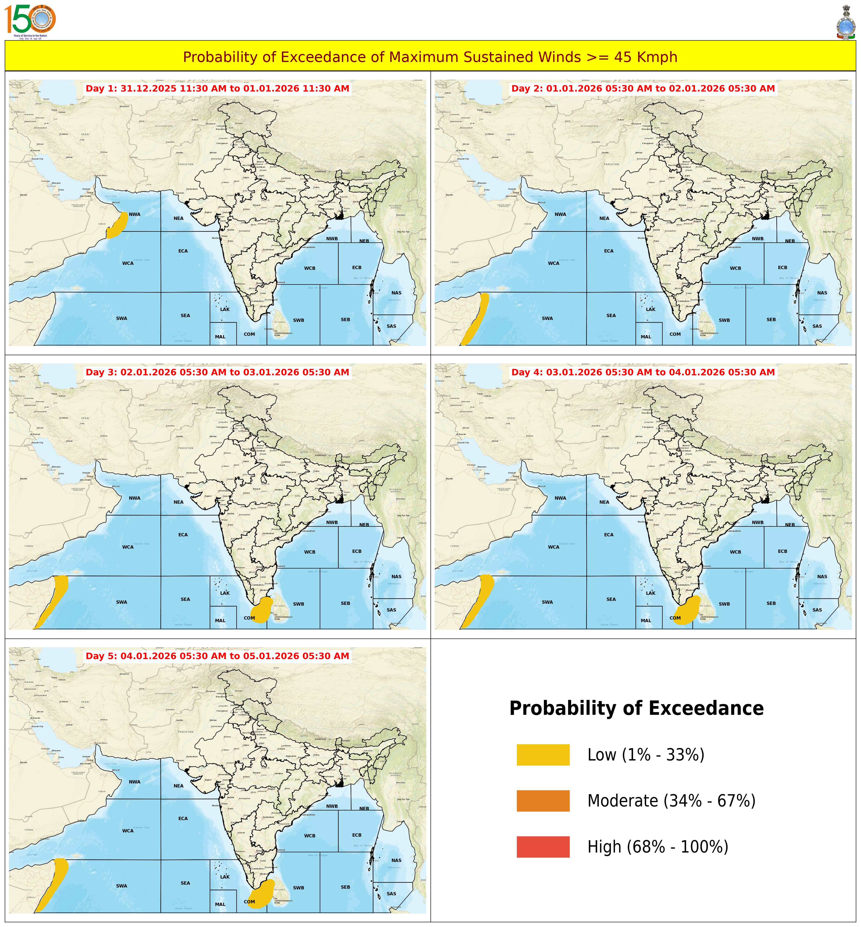 Probability of Exceedance 45Kmph (25 Knots) based on 03:00:00 UTC of 29-12-2025 |