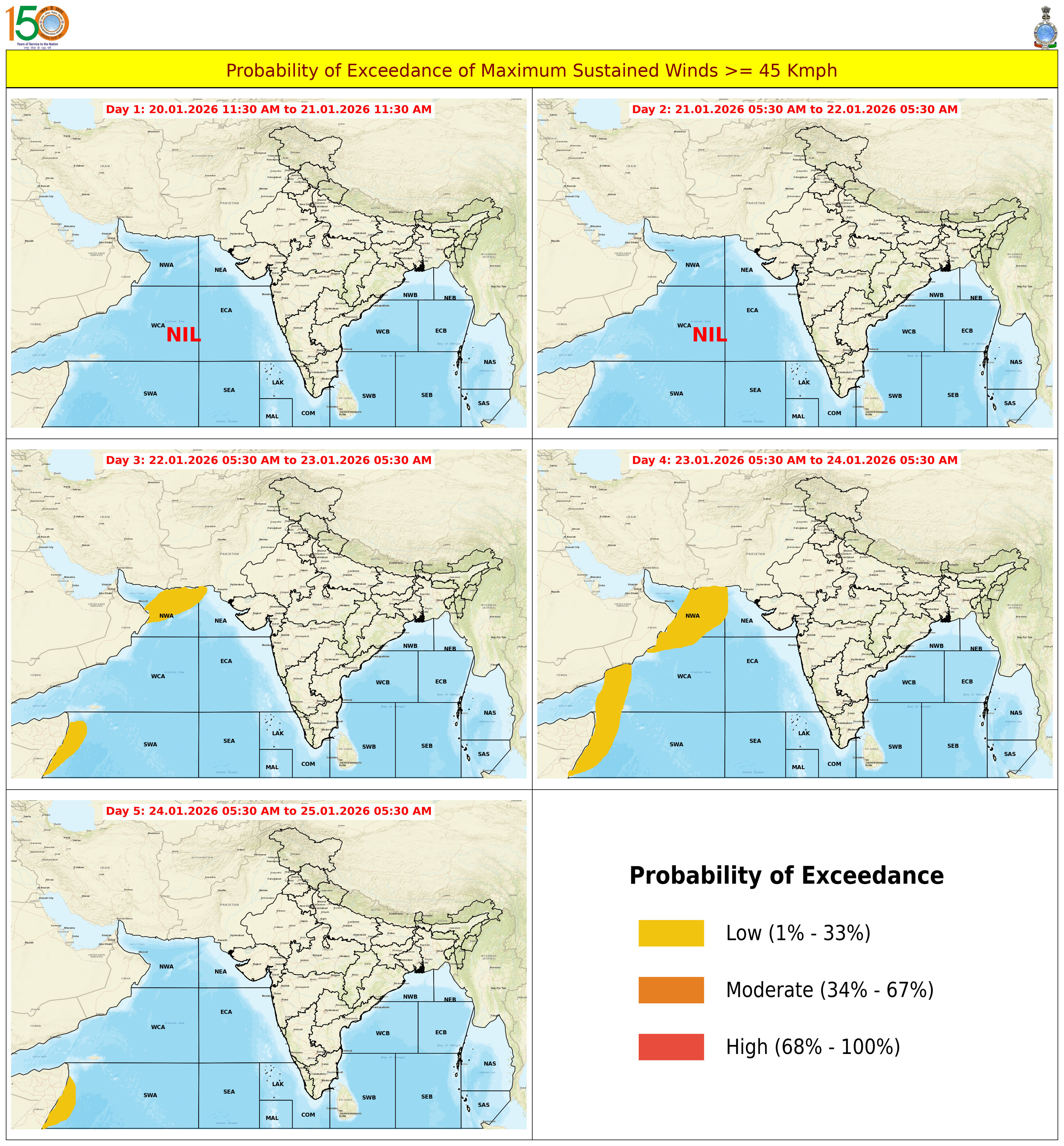 Probability of Exceedance 45Kmph (25 Knots) based on 03:00:00 UTC of 20-01-2026 |