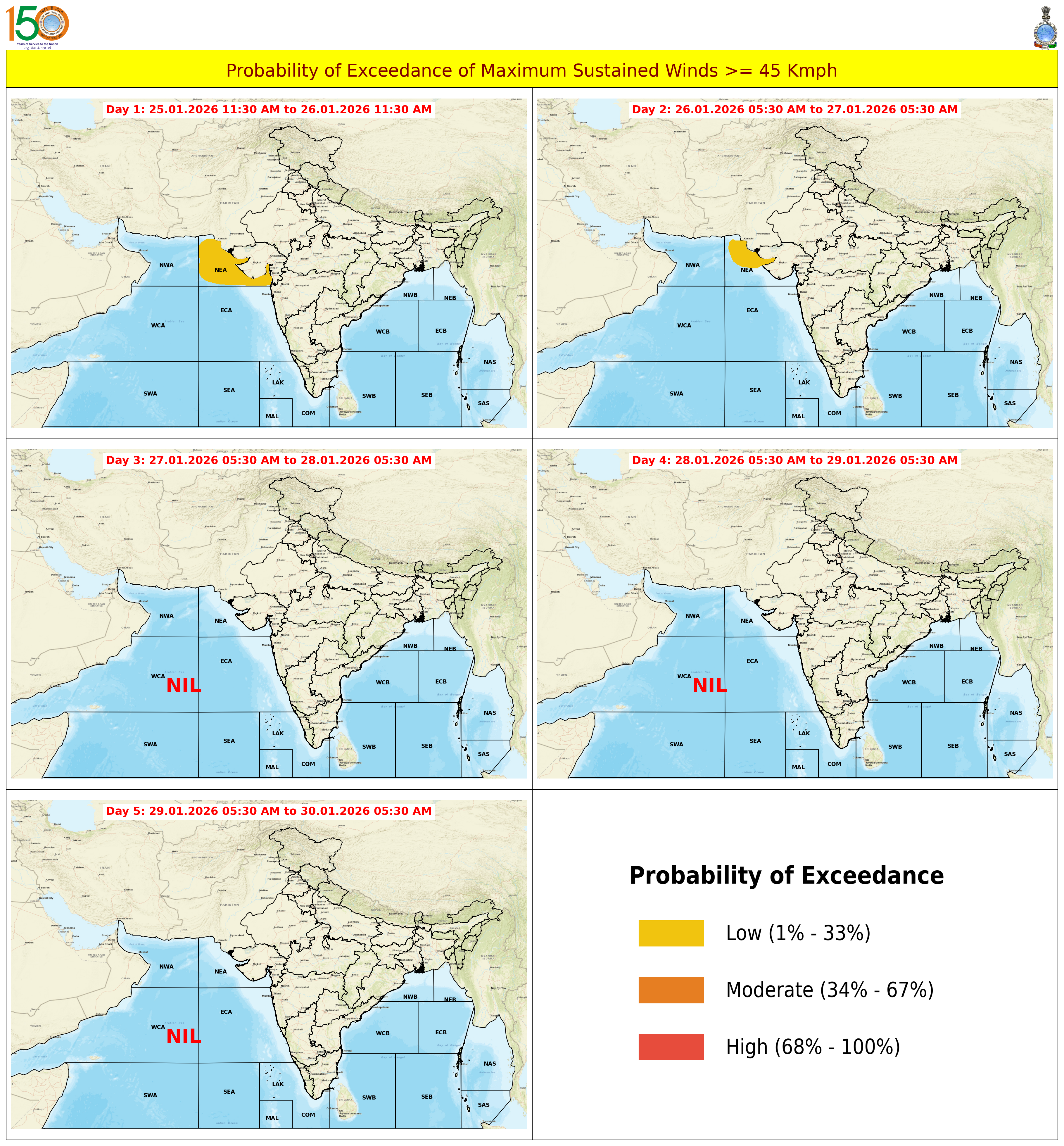 Probability of Exceedance 45Kmph (25 Knots) based on 03:00:00 UTC of 15-01-2026 |