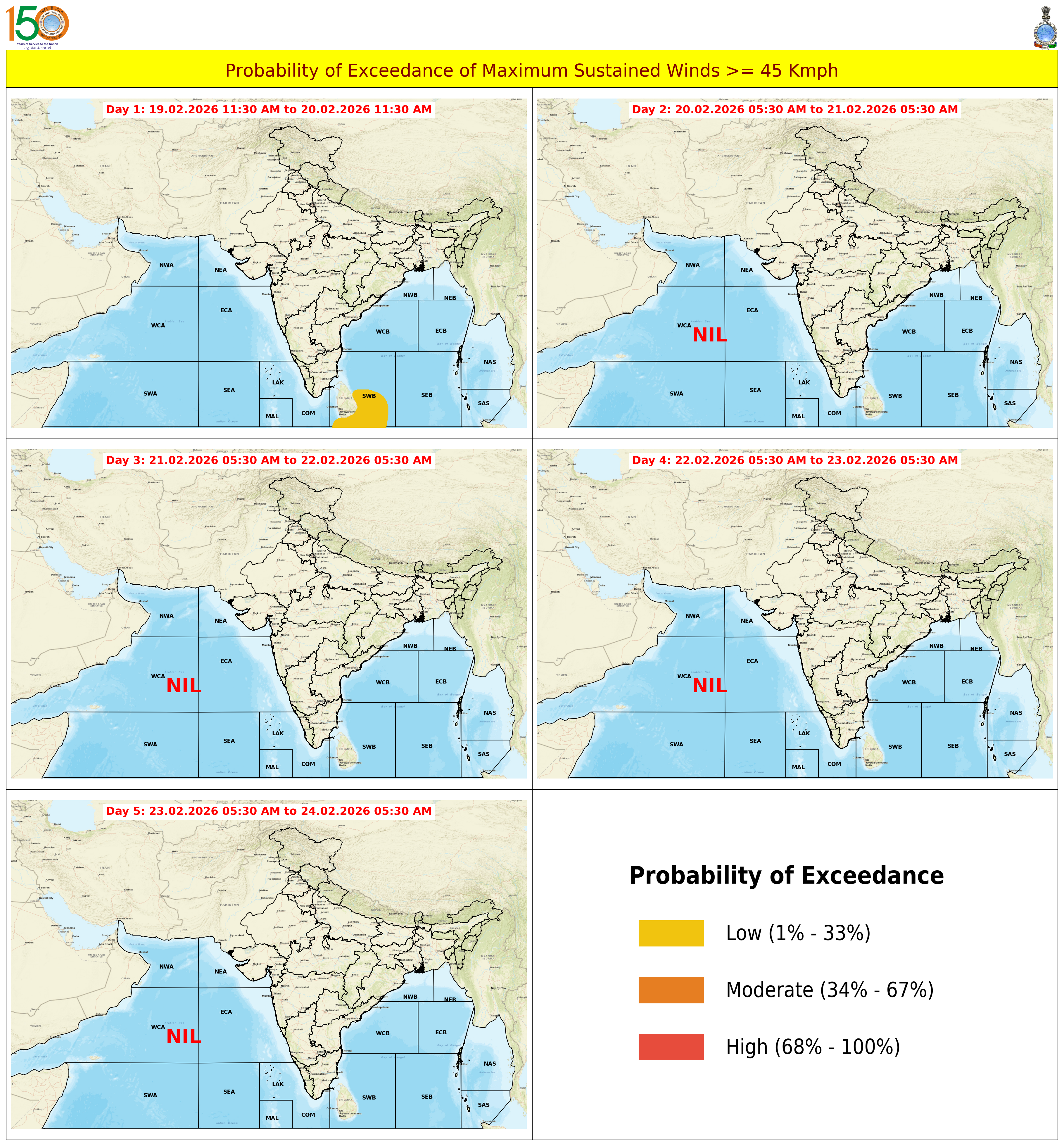 Probability of Exceedance 45Kmph (25 Knots) based on 03:00:00 UTC of 19-02-2026 |